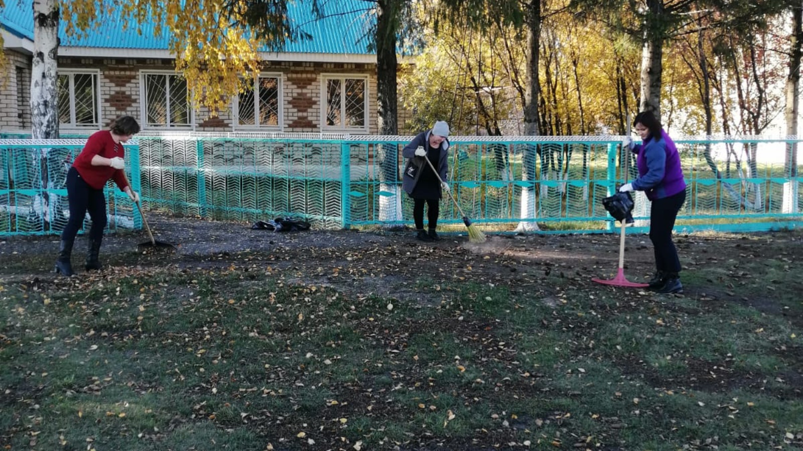 Работники учреждений сельского поселения очистили от листьев прилегающие территории.