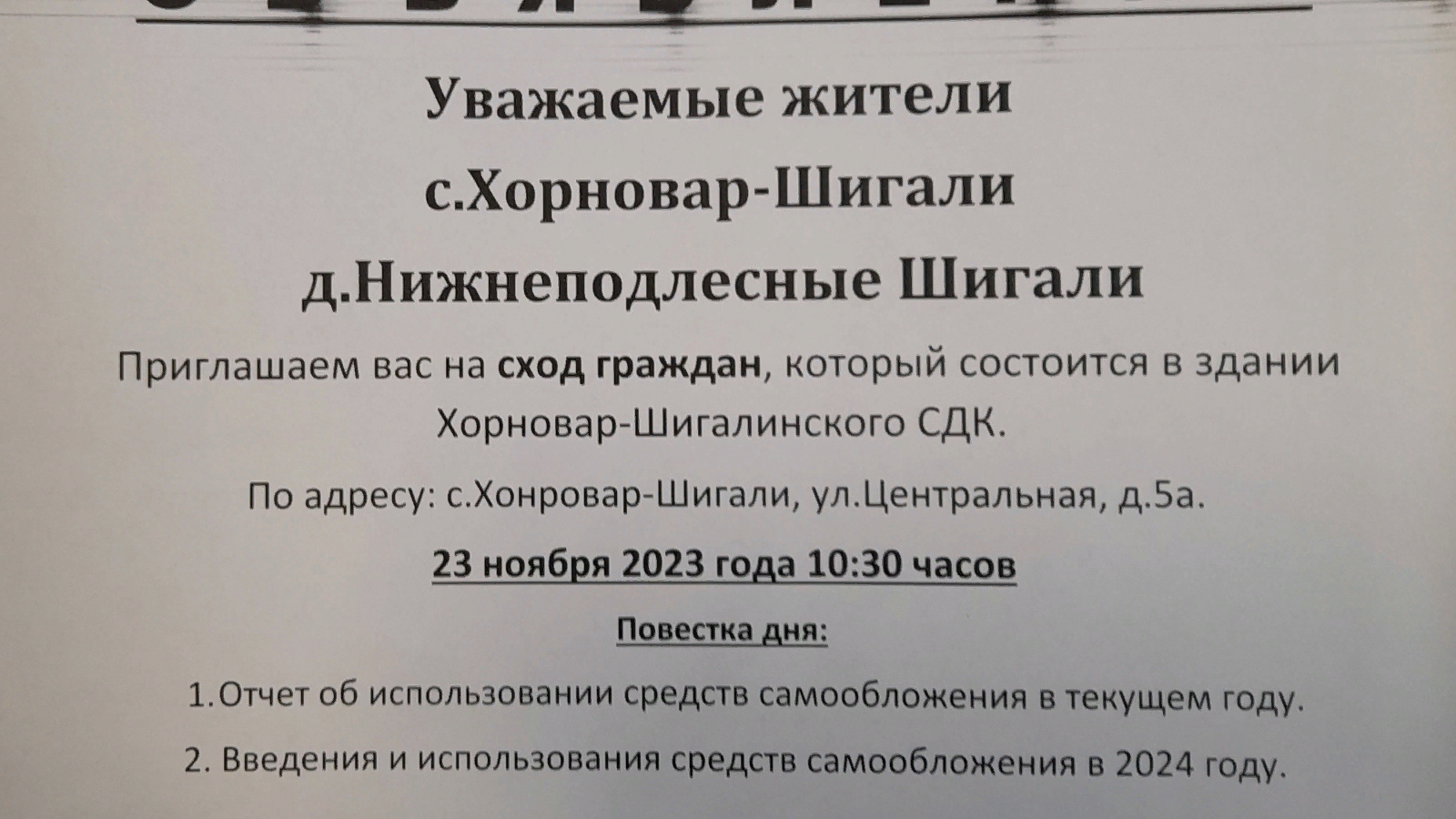Приглашаем вас на сход граждан, который состоится в здании Хорновар-Шигалинского СДК.