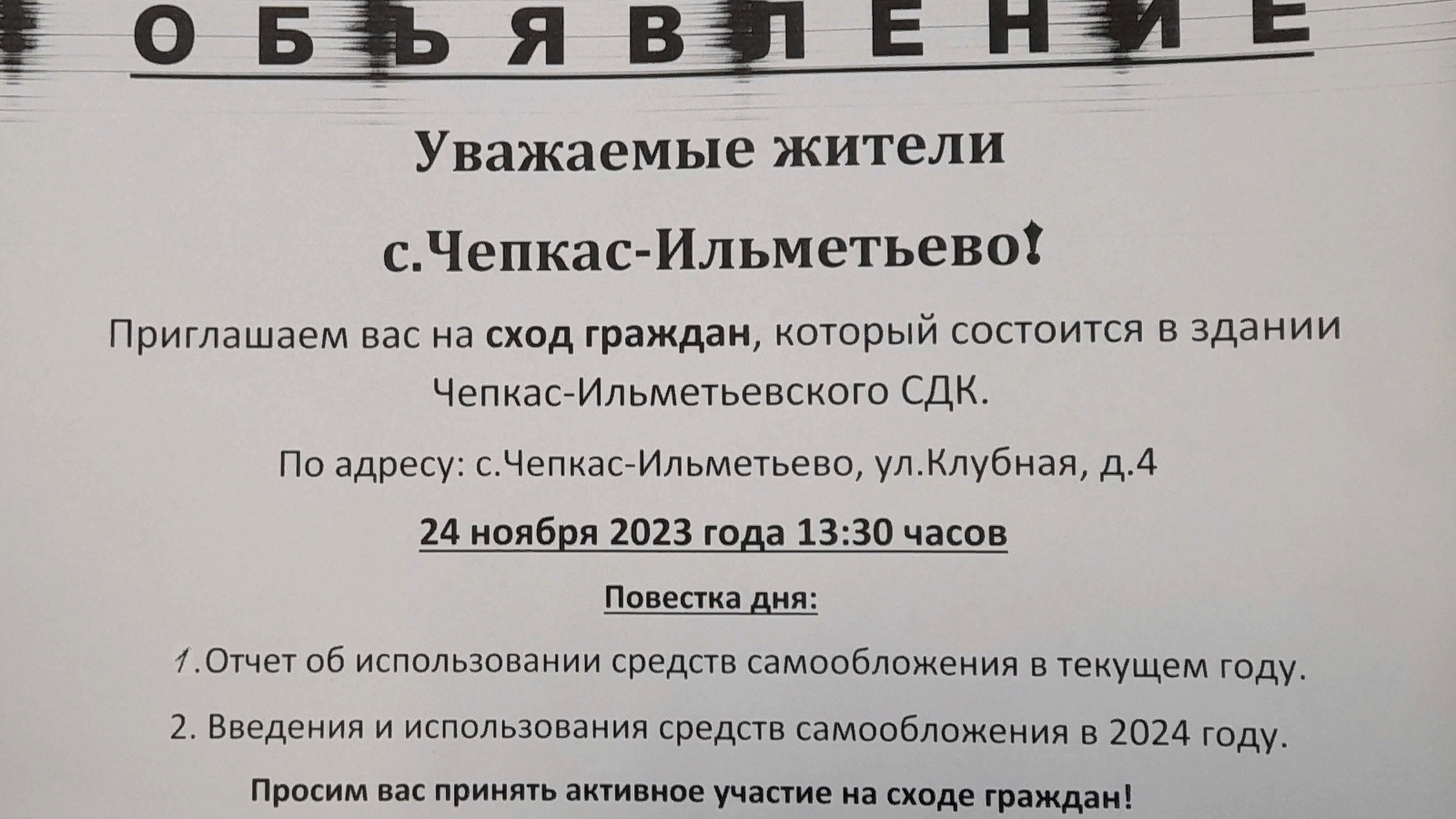 Приглашаем вас на сход граждан, который состоится в здании Чепкас-Ильметьевского СДК.